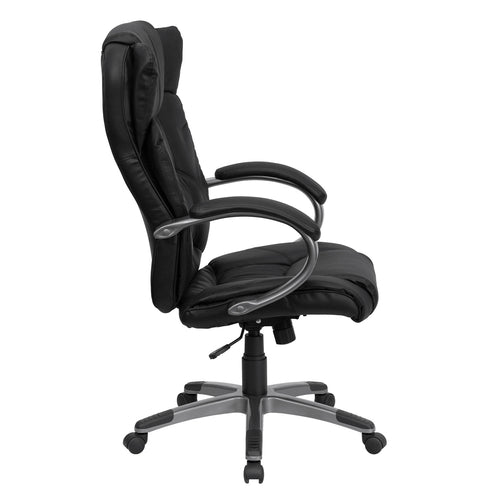 Executive Swivel Office Chair, 44-1/2" to 48-1/4" adjustable height, 250 lb. weight capacity, high back design, contoured back, contoured waterfall seat, with headrest, LeatherSoft upholstery, built-in lumbar support, tilt lock mechanism, tilt tension adjustment knob, padded loop arms, CA117 fire retardant foam, heavy duty titanium nylon base with black end caps, dual wheel casters, black (assembly required) (temporarily out of stock, contact factory for availability)