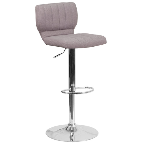 Swivel Barstool, adjustable height, contemporary style, low back design, upholstered back and seat with vertical lines, gas lift, adjustable from counter to bar height, footrest, 17-5/8" dia. chrome base, CA117 fire retardant foam, designed for residential use, gray fabric (assembly required) (in stock items usually ship within 24 hours)