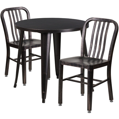Table and Chair Set, includes (1) 30" dia. x 29-1/2"H table, round, smooth top, 1-1/4" thick edge, brace underneath top, (2) 15-1/2"W x 20"D x 33-1/4"H chairs, vertical slat back, metal, powder coat finish, rubber floor glides on table, adjustable floor glides on chairs, designed for indoor/outdoor commercial and residential use, black and antique gold (assembly required) (shipped in 2 boxes) (in stock items usually ship within 24 hours)