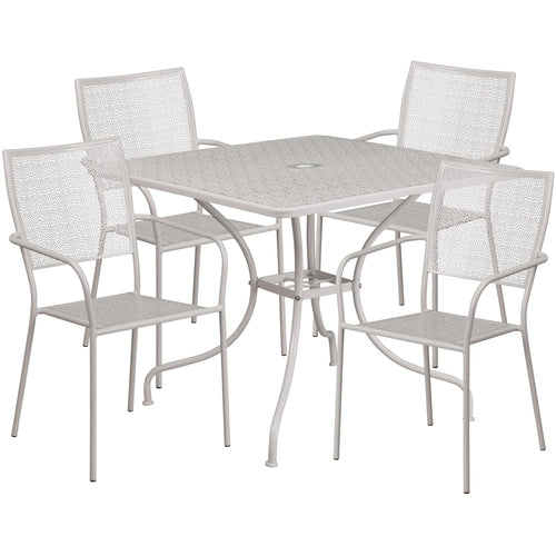 Patio Table Set, includes (1) table: 35-1/2"W x 35-1/2"D x 28-3/4"H, square, rain flower design top, 1-3/4" dia. umbrella hole, 1" edge, (4) stacking arm chairs: square back, rain flower design back and seat, 1.2mm tubular frame, 300 lb. weight capacity, stacks up to 8 chairs high, plastic floor glides, designed for indoor/outdoor use, steel, powder coat finish, light gray (assembly required) (shipped in 2 boxes) (in stock items usually ship within 24 hours)