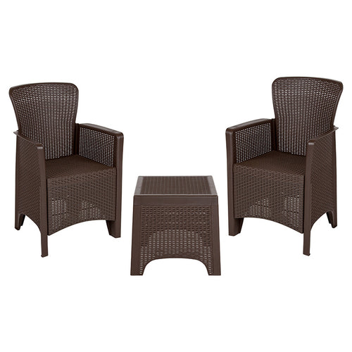 Seating Set, 3-piece, (2) 22-1/2"W x 19-1/4"D x 33-1/2"H chairs, and (1) 15-1/4"W x 15-1/4"D x 15-1/2"H side table, straight arms, all weather, faux rattan, resin frame, interlocking construction, designed for outdoor use, chocolate (assembly required) (in stock items usually ship within 24 hours)