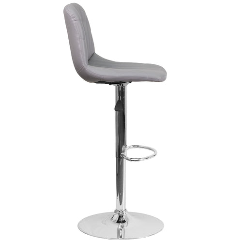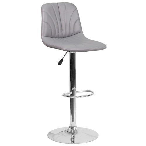 Swivel Bar Stool, adjustable height, contemporary style, mid-back design, upholstered back and seat with stylish line stitching, gas lift, adjustable from counter to bar height, footrest, 17-5/8" dia. chrome base, CA117 fire retardant foam, designed for residential use, gray vinyl (assembly required) (in stock items usually ship within 24 hours)