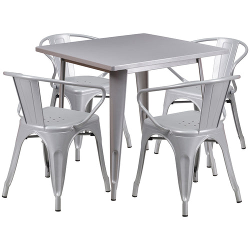 Table and Chair Set, includes (1) 31-1/2"W x 31-1/2"D x 29-1/2"H table, square, smooth top, 1" thick edge, brace underneath top, (4) 21-1/2"W x 19"D x 27-3/4"H chairs, curved back with vertical slat, integrated arms, drain holes in seat, cross brace under seat, galvanized steel, powder coat finish, rubber floor glides, designed for indoor/outdoor commercial and residential use, silver (assembly required) (shipped in 2 boxes) (in stock items usually ship within 24 hours)