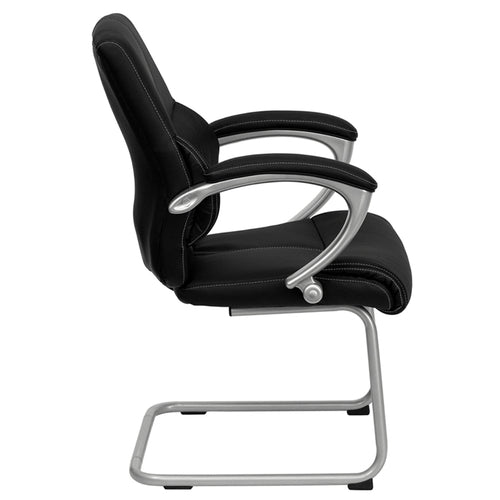 Executive Side Chair, 250 lb. weight capacity, waterfall seat, contrasting white stitching, contoured cushions, LeatherSoft upholstery, built-in lumbar support, curved padded arms, CA117 fire retardant foam, silver powder coated finish, sled base, non-skid anti-tilt floor levers, black (assembly required) (in stock items usually ship within 24 hours)