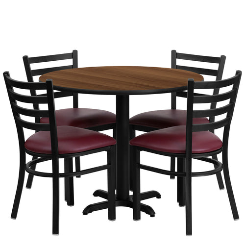Table and Chair Set, includes (1) 36" dia. x 30"H table, round, black T-mold edge, MDF with high impact melamine core, walnut laminate finish, cast iron x-base with black powder coated finish, (4) 16-1/2"W x 17"D x 32-1/4"H chairs, metal ladder back, burgundy vinyl upholstered padded seat, 2-1/2" thick CA117 fire retardant foam, welded joint assembly, curved support bar, 18 gauge steel black powder coated frame, plastic floor glides, designed for residential and commercial use (assembly required) (shipped in 5 boxes) (1-2 business days lead time)