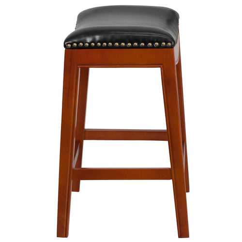 Bar Stool, 26"H seat, counter height, backless, upholstered saddle seat with nailhead trim, CA117 fire retardant foam, transitional style, wood frame with light cherry finish, footrest, protective floor glides, designed for residential use, black LeatherSoft upholstery (assembly required) (in stock items usually ship within 24 hours)