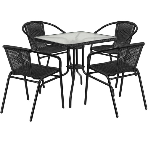 Table & Chair Set, includes (1) 28"W x 28"D x 28"H table, square, 5mm thick glass top, 1-3/8" thick edge, decorative black rattan band, black powder coated metal base, protective plastic floor glides, (4) stacking cafe armchairs, curved back, black rattan back and seat, black powder coat metal frame, plastic floor glides, lightweight, designed for indoor/outdoor use (assembly required) (shipped in 2 boxes) (in stock items usually ship within 24 hours)