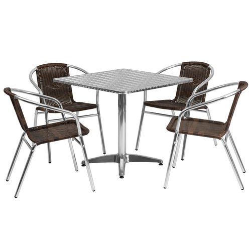 Table & Chair Set, includes (1) 31-1/2"W x 31-1/2"D x 27-1/2"H table, square, smooth stainless steel top, aluminum column and base, (4) 21-3/4"W x 22"D x 29"H stacking chairs, curved back, dark brown rattan seat and back, integrated arms, cross braces, aluminum frame, plastic floor glides, lightweight, designed for indoor/outdoor commercial and residential use (assembly required) (shipped in 2 boxes) (in stock items usually ship within 24 hours)