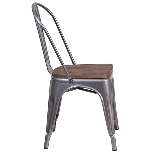 Stacking Side Chair, 500 lb. weight capacity, stackable, curved back with vertical slat, textured wood seat, cross brace under seat, distressed metal, powder coat finish, rubber floor glides, lightweight, stacks up to 8 chairs high, silver (in stock items usually ship within 24 hours)