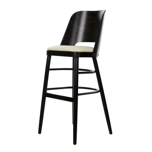 Poppin Bar Stool, extra wide, wood cut-out back, upholstered seat, wood frame, footrest, grade 9 uph.