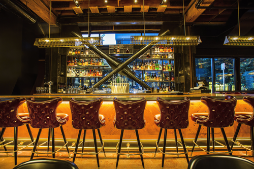2516 Cowboy Swivel Bar Stool, upholstered inner plain & diamond tufted with nail head trim back, upholstered seat, partially welded frame, black powder coat, brass ferrules and glides, Spirit Millennium vinyl