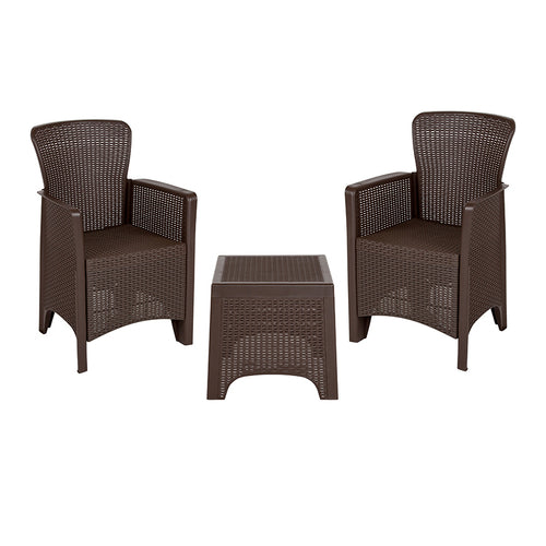 Seating Set, 3-piece, (2) 22-1/2"W x 19-1/4"D x 33-1/2"H chairs, and (1) 15-1/4"W x 15-1/4"D x 15-1/2"H side table, straight arms, all weather, faux rattan, resin frame, interlocking construction, designed for outdoor use, chocolate (assembly required) (in stock items ship within 24 hours)