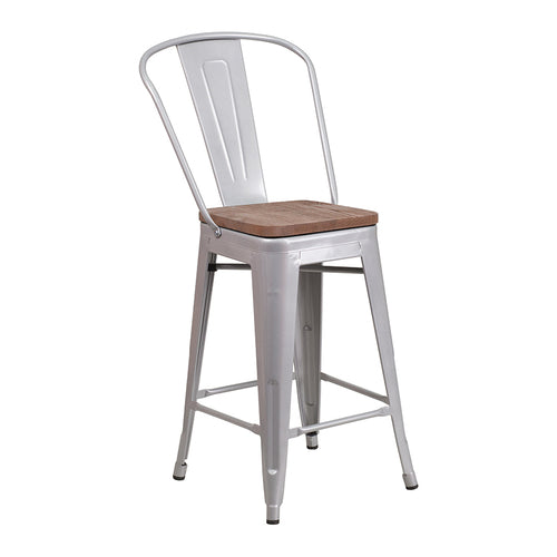 Bar Stool, 500 lb. weight capacity, counter height, bistro style, metal curved back with vertical slat, textured wood seat, cross brace, footrest, protective powder coat finish, rubber floor glides, lightweight design, silver (assembly required) (in stock items ship within 24 hours)