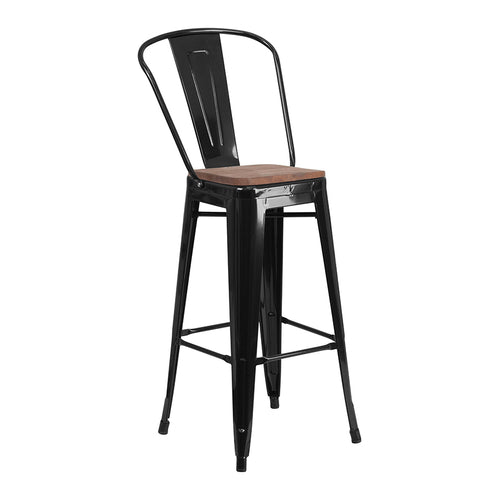 Bar Stool, 500 lb. weight capacity, counter height, bistro style, metal curved back with vertical slat, textured wood seat, cross brace, footrest, protective powder coat finish, rubber floor glides, lightweight design, black (assembly required) (in stock items ship within 24 hours)