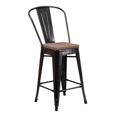 Bar Stool, 500 lb. weight capacity, counter height, bistro style, metal curved back with vertical slat, textured wood seat, cross brace, footrest, protective powder coat finish, rubber floor glides, lightweight design, black antique gold (assembly required) (in stock items ship within 24 hours)