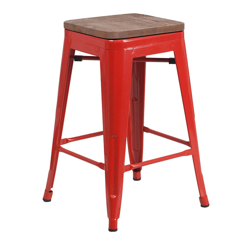 Bar Stool, 500 lb. weight capacity, counter height, backless, textured wood seat, cross brace under seat, galvanized steel, powder coat finish, footrest, powder coat finish, plastic floor glides, lightweight, stacks 4 to 8 stools high, red (assembly required) (in stock items ship within 24 hours)