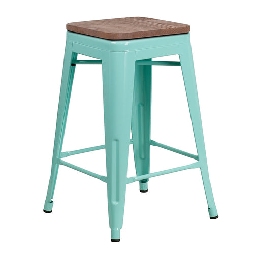 Bar Stool, 500 lb. weight capacity, counter height, backless, textured wood seat, cross brace under seat, galvanized steel, distressed powder coat finish, footrest, plastic floor glides, lightweight, stacks up to 10 chairs high, mint green (in stock items ship within 24 hours)