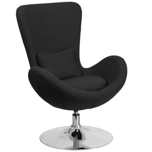 Egg Series Swivel Reception/Lounge/Side Chair, integrated curved arms, 13"W x 10"H x 2" thick lumbar pillow, seat cushion, fabric upholstery, CA117 fire retardant foam, 21-1/2" dia. chrome base, black (assembly required) (in stock items ship within 24 hours)