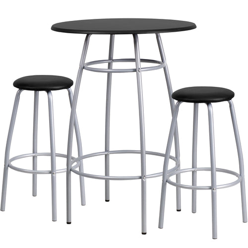 Pub Table and Bar Stool Set, bar height, includes (1) 30" dia. x 41-1/2"H pub table, round, 3/4" thick black MDF top, floor glides on table, (2) 13"W x 28-1/2"H bar stools, backless, 1" thick padded black vinyl seat, silver powder coated frame (assembly required) (in stock items ship within 24 hours)