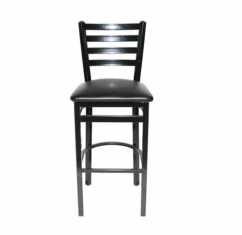 Bar Stool, ladder back, black vinyl upholstered seat, metal frame with matte black finish