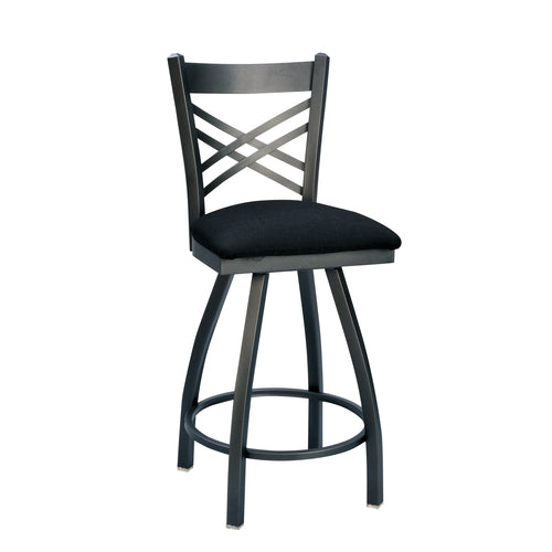 Cross Swivel Bar Stool, counter height, indoor use, 24" seat height, crisscross metal back, upholstered seat, foot rest