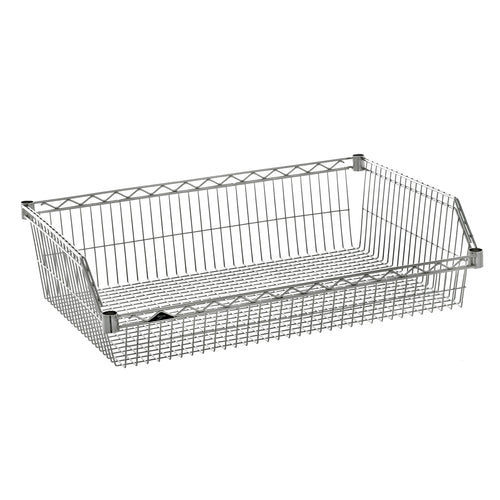 Super Erecta® Basket Shelf, 48"W x 24"D, hopper style, 5" basket height in front, 9" height on sides and rear, 1" wire spacing, chrome plated finish, NSF