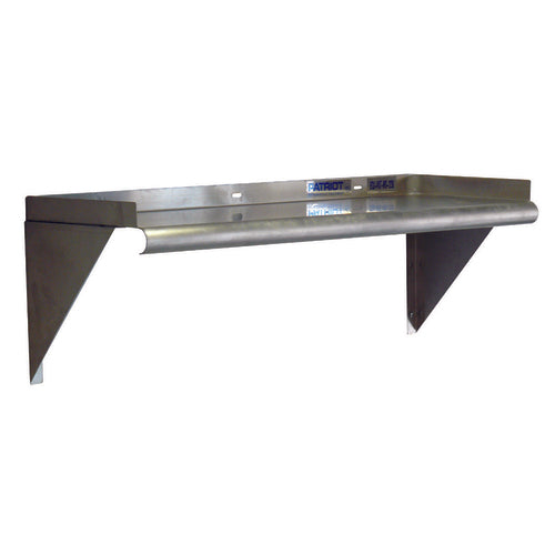Wall Shelf, 48" x 12", 430 polished stainless steel shelf top with 3 sided splash, curved front edge, pre-drilled mounting holes, NSF