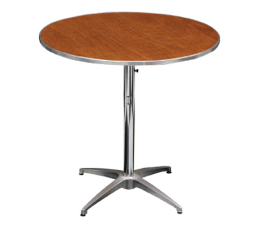 200 Series Pedestal Table, round, 24" dia., adjustable height, 3-piece, 5/8" thick plywood top with walnut sealer stain & UV polycoat, aluminum "C" channel edge, steel tapered column attached to k-plate and base, shipped KD