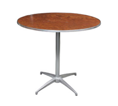 200 Series Pedestal Table, round, 30" dia. x 30"H, 3-piece, 5/8" thick plywood top with walnut sealer stain & UV polycoat, aluminum "C" channel edge, steel tapered column attached to k-plate and base, shipped KD