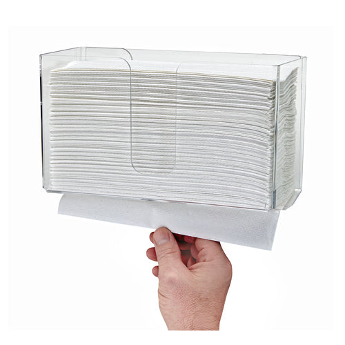 Towel Dispenser, 10-1/5"W x 4-1/5"D x 6-4/5"H, wall-mounted, holds (150) C-fold paper towels, open filling slot, bottom dispensing, with mounting hardware, acrylic, clear