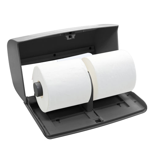 Toilet Tissue Dispenser, surface mount, double 4-1/2" roll, 6-1/3"W x 6-1/3"D x 10-1/3"H, oblong, with transfer paddle, lock feature, includes: mounting hardware, ABS plastic, gray