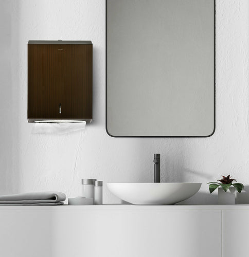 Paper Towel Dispenser, 11-1/5"W x 4"D x 14-1/2"H, wall-mounted, holds (400) c-fold or (525) multi-fold paper towels, level indicating window, lock & key, 304 stainless steel, brushed finish, brushed antique copper