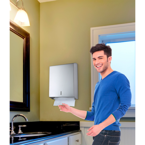 Towel Dispenser, 11-1/5"W x 4"D x 14-1/2"H, wall-mounted, holds (400) c-fold or (525) multi-fold paper towels, level indicating window, lock & key, 304 stainless steel, brushed finish