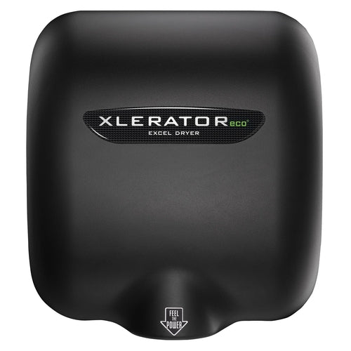 XLERATOReco® Hand Dryer, surface-mounted, 10 seconds dry time, automatic sensor activated, adjustable speed & sound controller, 35 second lockout feature, red LED light, painted epoxy, raven black finish, OSHA Approved, Building Green Approved, cULus, CE, RoHs, Made in USA