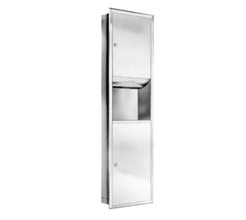 Bradley® Paper Towel Dispenser, 15-5/8" x 4" x 54-1/2" H rough wall opening, recess mounted, for C-fold or multi-fold towels, with removable waste receptacle behind locking hinged door, stainless steel