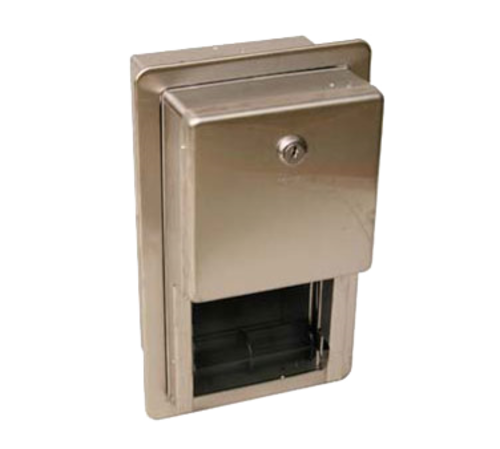 Bobrick Tissue Dispenser, reserve roll toilet, holds 2 rolls, 6-1/4" x 3-1/4" x 11-1/4" H, recess mounted, locking hinged door, theft resistant, stainless steel with satin finish