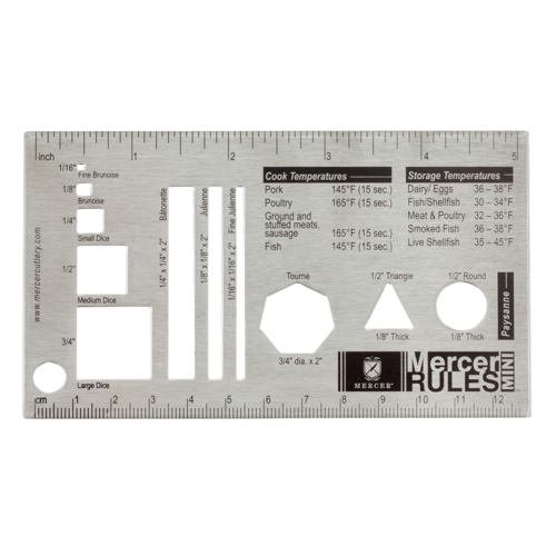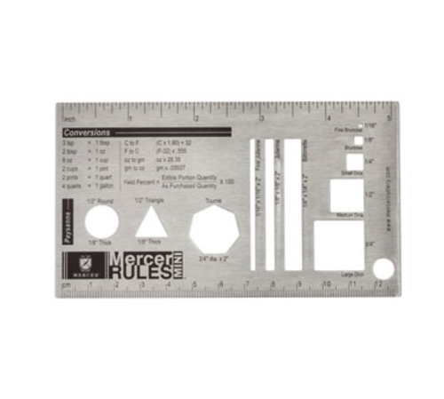 Mercer Rules Mini™, 5-1/4" x 3" size, fits in shirt or chef coat pocket, US and metric measurements, ingredient ratios, and cut shapes shown, stainless steel