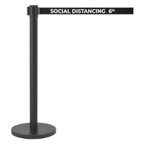 Form-A-Line™ Crowd Control System, 40"H, indoor use, 7' retractable double-sided printed black belt style "Social Distancing 6ft", 30 lb base, protective rubber floor guards, black powder coated finish