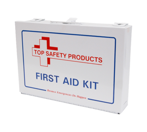 First Aid Kit, 25 Person, 10-7/8"L x 7-3/8"W x 2½"D, white metal outer case, box comes with hinged plates for optional wall mounting and collapsible handle includes: (1) Burn Cream - 1/2 oz Tube (1) Cold Pack (1) Combine Pad - 5" X 9" (1) Cotton Sterile - 1/2 0Z (1) Eye Irrigate Solution - 1 oz (1) First Aid Guide (1) Pair Nitrile Gloves (1) Pair Of Scissors (1) Pair Of Tweezers (1) Triangular Bandage (10) Alcohol Wound Wipes (12) Aspirin Tablets (2) Adhesive Tape Rolls - 1/2" X 2 1/2 Yd (2) Eye Pads (2) Gauze Bandages - 2" Wide Roll (2) Gauze Pads - 4" X 4" (3) Ammonia Inhalants (3) Sting Relief Wipes (4) Gauze Pads - 3" X 3" (48) 1" X 3" Adhesive Strips