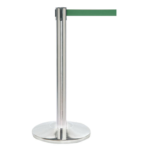 Stanchion, includes: (1) 40"H post, (1) 14" dia. tapered 30 lb. base with protective rubber floor guards & (1) 7' green belt, chrome steel post & base (1 year limited warranty)
