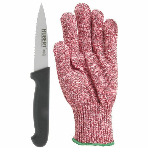 Essentials Pro Max Glove, medium, ambidextrous, serrated cut-resistant, ANSI cut level 7, color-coded cuff to indicate size, dishwasher safe, Tuff-Cuff™ & Comfort Fit™ technology, DoubleGuard™ antimicrobial protection, Dyneema® & stainless steel yarn construction, red with green wristband, (1) bonus Soft Grip serrated paring knife with 3-1/2" blade, FDA approved, CFR 21 compliant, CE, NSF