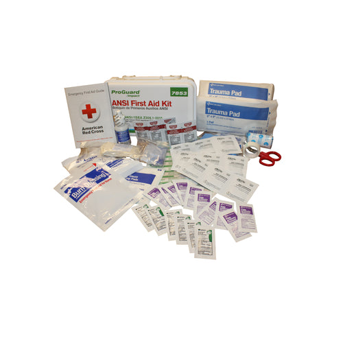 First Aid Kit, 10-person, includes (1) pair disposable gloves, (1) disposable face shield, (1) disposable face mask, (1) pair disposable shoe covers, (1) disposable apron, (1) absorbent pack, (2) disposable towelettes, (2) scoops/scrapers, (2) red biohazard bags with ties, (1) disposable towel, (1) instruction sheet, (1) 2 oz. spray pump disinfectant, plastic case, ANSI Z308.1, OSHA (minimum order = 1 each)