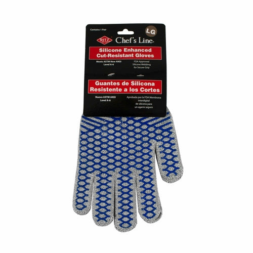 Ritz® Chef's Line® Cut Glove, bleach safe, machine washable, FDA approved silicone webbing, grey/brown with blue grip ANSI level A6, large (pair)