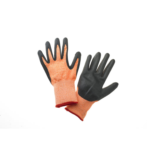 Millennia® Food Processing Gloves, 13 gauge, nitrile coated palm and fingertips, washable and bleach safe, HPPE reinforced construction, FDA approved materials, ANSI level A4 cut protection, color-coded cuff to indicate size, orange with red cuff, small (12 pair per case)