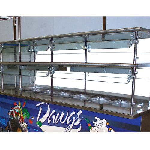 Sleek Shield™ Food Shield, self service with adjustable front glass, double tier, 144"W x 15"D x 34"H, with stainless steel top shelf, 1/4" thick heat tempered glass front & side panels (side panels 18" deep to meet NSF requirements), equipped with Chamber Lock™ technology fixed to upright legs, allowing rotation in 15 degree intervals, includes: additional center support leg