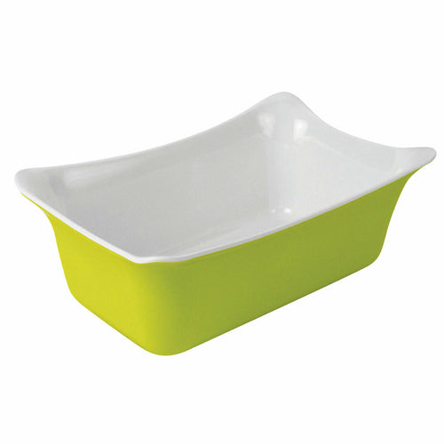 Fleur Collection Deli Crock, GN 1/4 size, 2 qt., 10-1/2"L x 6-1/2"W x 4"H, fits TC3314L, T4414, T4514, TB4414 & TB4514, rectangular, flared rim, anti-slip silicone feet, chip and stain resistant, dishwasher safe, melamine, white interior, lime green exterior, Dalebrook