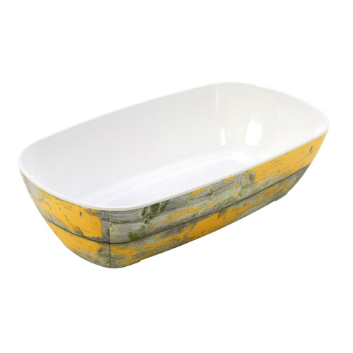 Tura Collection Deli Crock, GN 1/3 size, 1-3/4 qt., 7"L x 12-3/4"W x 3-1/4"H, rectangular, anti-slip silicone feet, chip and stain resistant, dishwasher safe, melamine, faux wood rustic yellow, Dalebrook