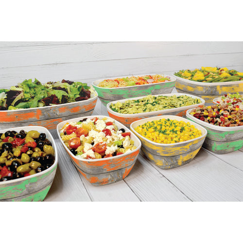 Tura Collection Deli Crock, GN 1/4 size, 1-1/4 qt., 10-1/2"L x 6-1/2"W x 3-1/4"H, rectangular, anti-slip silicone feet, chip and stain resistant, dishwasher safe, melamine, faux wood rustic orange, Dalebrook
