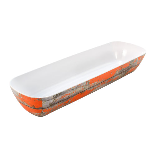 Tura Collection Deli Crock, GN 2/4 size, 3 qt., 20-3/4"L x 6-1/2"W x 3-1/4"H, rectangular, anti-slip silicone feet, chip and stain resistant, dishwasher safe, melamine, faux wood rustic orange, Dalebrook