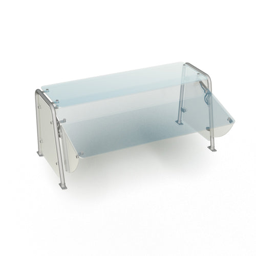 Contemporary Food Shield, 45-1/2"W x 20"D x 20-1/8"H, adjustable from full-service to self-service guard, single shelf, sloped guard with fixed end closures, 3/8" glass overshelf & guard with 1/4" glass ends (tempered with polished rounded edges), sloped Ø 1" tube posts, stainless steel finish posts mounted through countertop with mounting flange